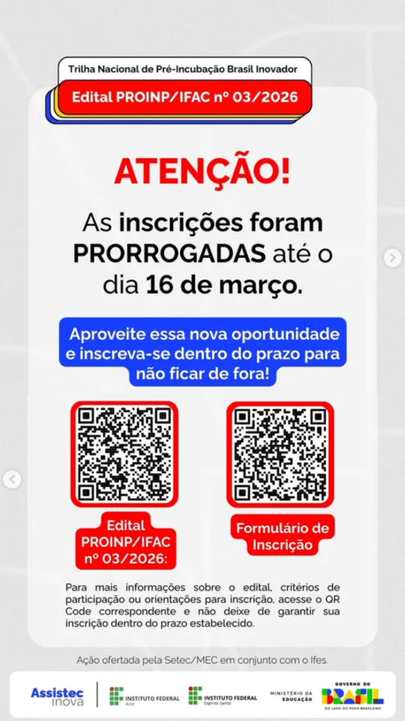 Iniciativa nacional destina R$ 1,6 milhão ao estado e oferece apoio financeiro para transformar ideias inovadoras em negócios de base tecnológica. O Programa Centelha segue com inscrições abertas no Acre até o dia 16 de abril de 2026, oferecendo uma oportunidade estratégica para o desenvolvimento de ideias inovadoras com potencial de mercado. Pela primeira vez,